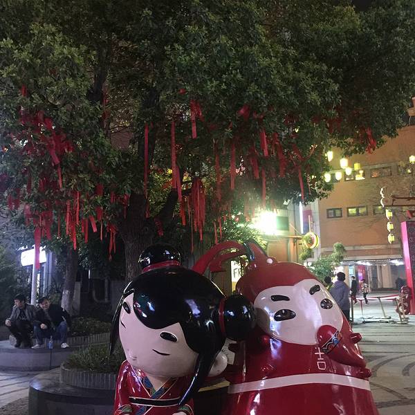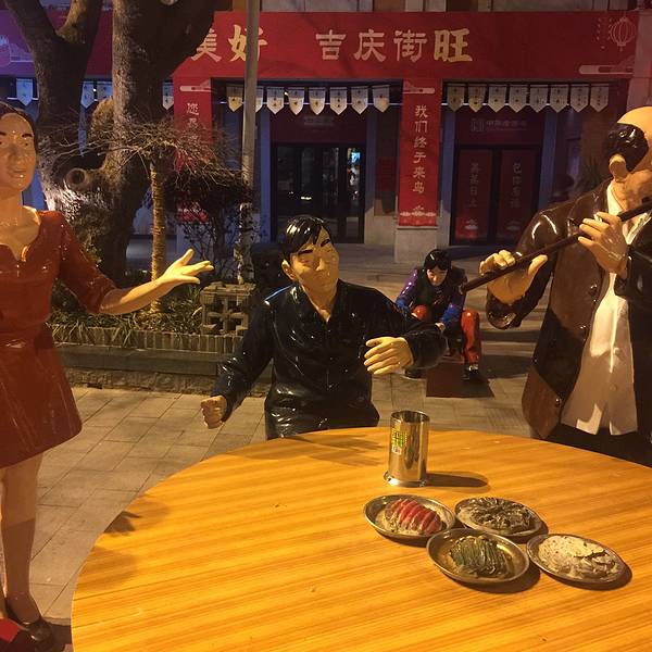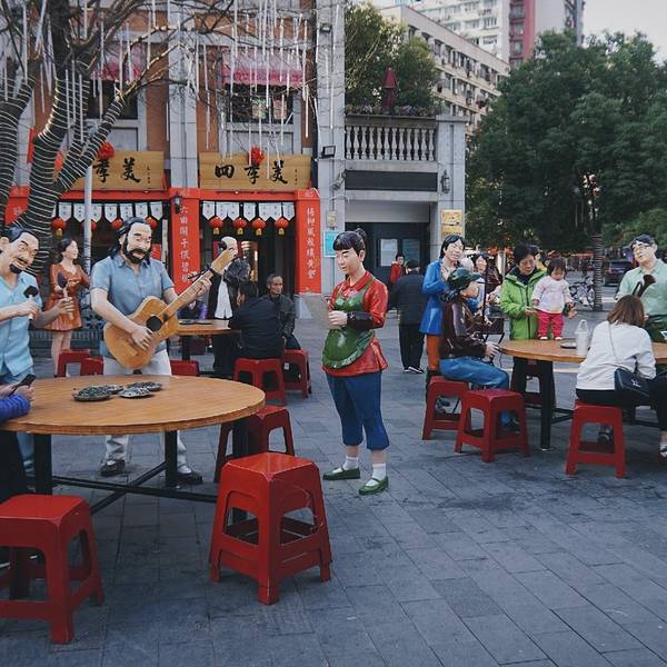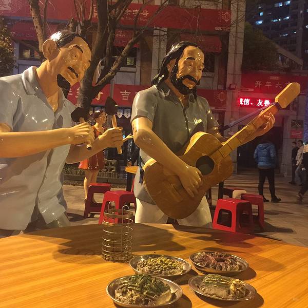 虽然这里是重新改建的吉庆街,街头围着桌子团团坐的雕塑还原着昔日的盛况,他们有的吃菜喝酒,有的弹琴吹喇叭,有上菜的服务员,有擦皮鞋的妇人,游客们纷纷坐上桌子“加入他们”拍有趣的照片。