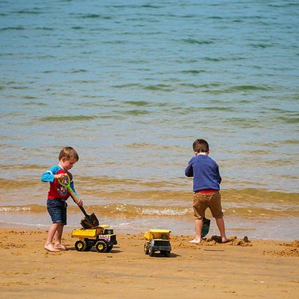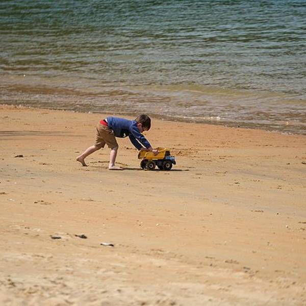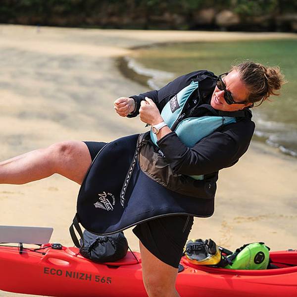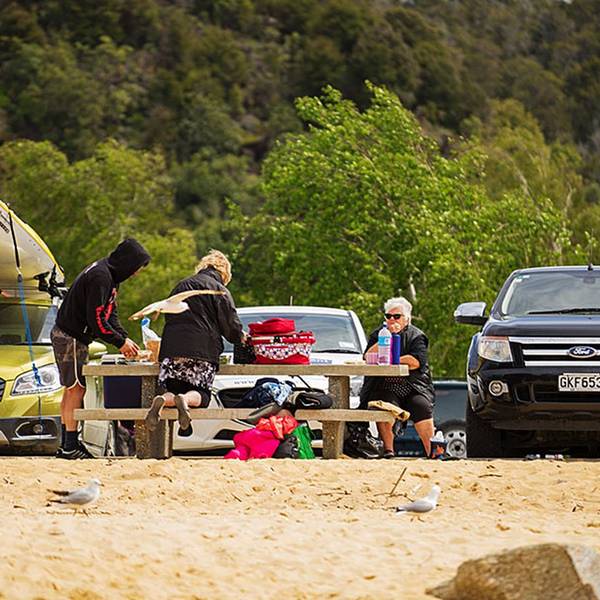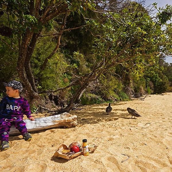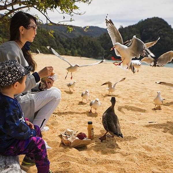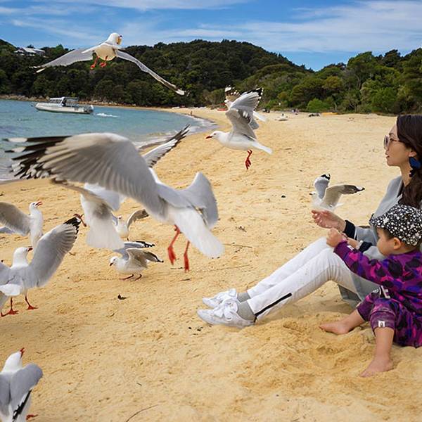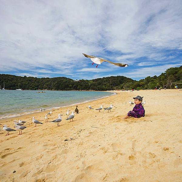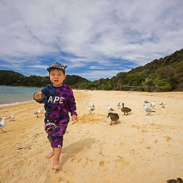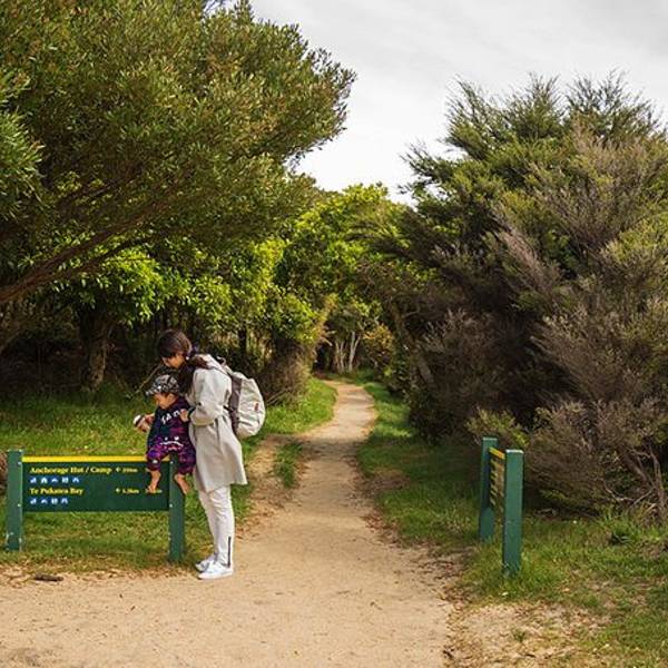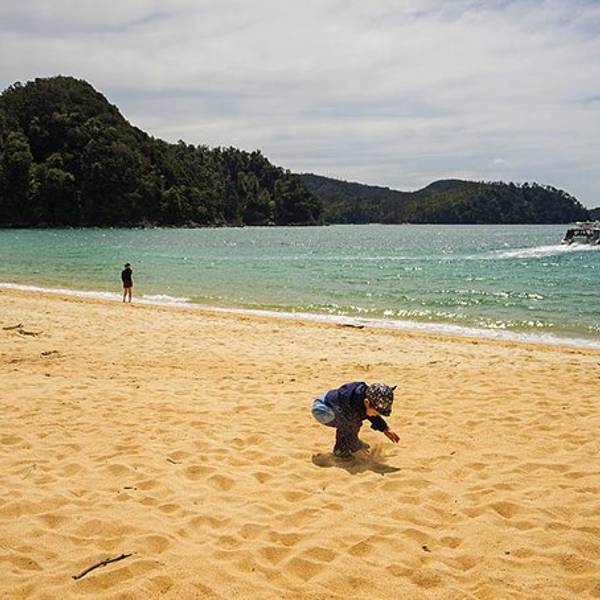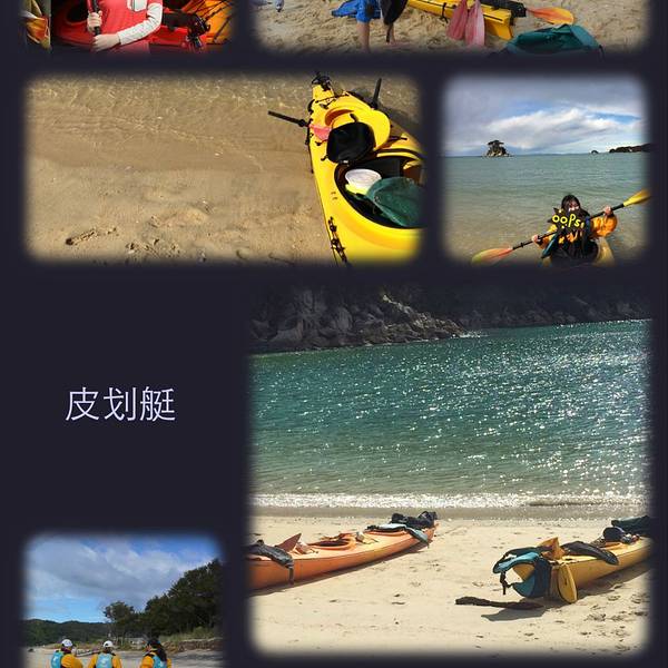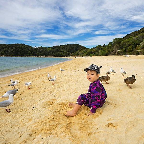 这是新西兰本地人最喜欢的度假地,我们到达那天是新西兰国庆,到处都是拖家带小的游客。停车场和游客中心,去各个岛活动的船都在这里出发。新西兰的小朋友都是从小被冻出来的。逸boss还穿着外套,人家小朋友短裤下海了。小朋友在沙难玩车,老爸们聚在一起聊天晒太阳,顺便就把娃看了。我们选择了两个项目,爸比去体验皮划艇;我和逸boss参加了游船和徒步的项目。