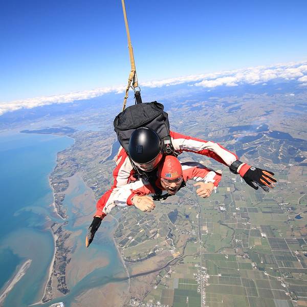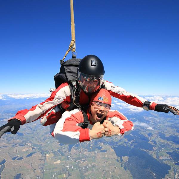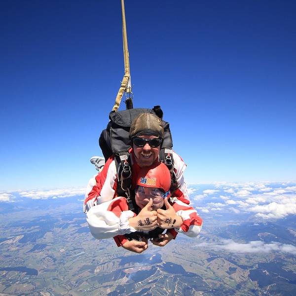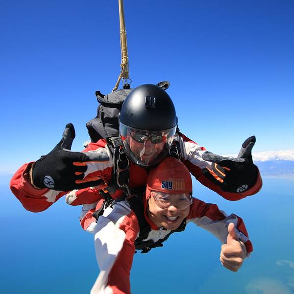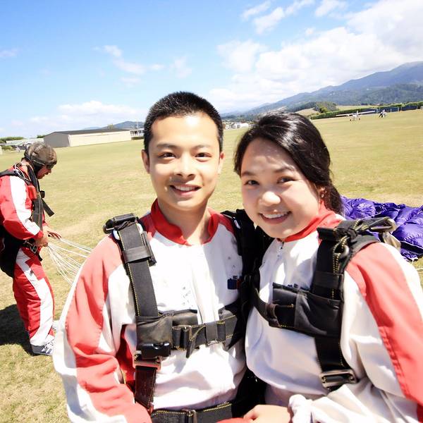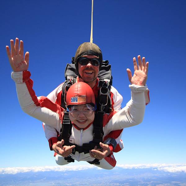 滑翔机缓缓起飞,20分钟后,教练带着我跳出飞机的一刻,我们终于在Abel Tasman完成人生第一次高空跳伞!足足45秒的自由落体的快感完全无法用言语去表达,那一刻你脑袋里根本不会去想其他东西,只想好好感受这种极速下坠的反冲将自己身体抬起的奇异体验!人生能有几次机会可以从接近4000米高空俯瞰蔚蓝的塔斯曼海,那一刻的感动,只想告诉全世界,此刻的美景只应天上有,美呆了!大家需要注意,当跳出飞机的一刻,耳膜会瞬间胀痛,这时候别忘记张大口尽情喊出你的兴奋!几十秒极速的自由落体后,教练会撑开降落伞,接下来就是10~20分钟缓缓降落至地面,这个时候可以静静看看你身下360度的美景,好好欣赏塔斯曼海壮观的景色。值得一提的是,缓缓降落的过程会有数次大幅度的旋转,连平时不怎么晕车的我也会有点受不了。所以如果有晕车的同学,建议跳伞前吃一点晕车药。另外近视的朋友也不必担心,跳伞全程有护目镜,虽然不能戴眼镜,但却是可以戴隐形眼镜的,不必担心看不清美景哈~ 展开