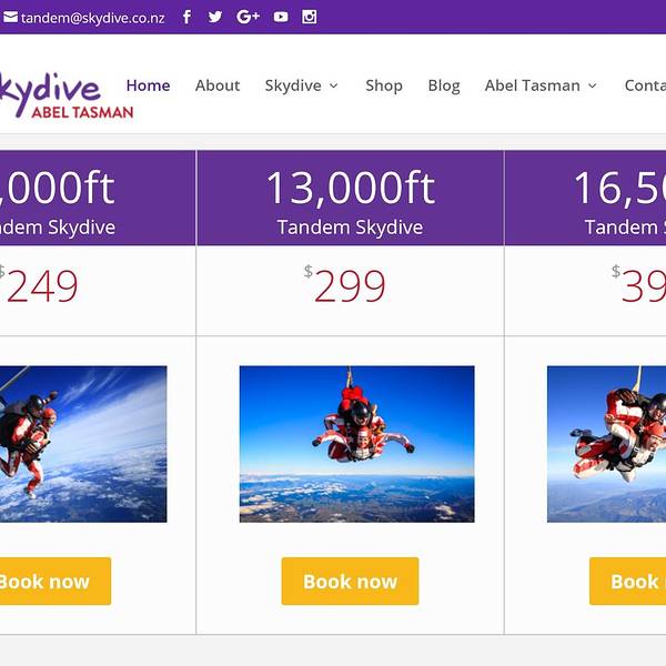 基本与新西兰别处的高空跳伞价格相当,分为高度9000英尺(约2743.2米)、13000英尺(约3962.4米)和16500英尺(约5029.2米),分别报价$249、$299、$399,也许大家对这个高度没什么概念。