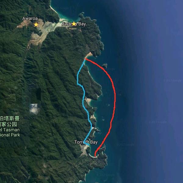 到了9点钟准时登船。塔斯曼国家公园内的第一地标是“Split Apple Rock”(碎苹果石),在很多旅游文章和杂志上都出现过。因为形状blablabla,看图就知道名字怎么来的了哈哈哈。然后游船把我们带到了一个叫Anchorage的沙滩,这里是我们今天皮划艇的起点位置。因为是淡季,所以这天皮划艇的游客只有3位,算上向导,一行4个人,两条皮艇,2小时水上划艇时间,然后紧接着6.5公里徒步。如下图所示,红色是皮划艇路线,从南向北,蓝色是徒步路线,从北向南。前面也说过,今天算上皮划艇向导,我们一共只有4个人,所以一路上我们两艘小艇始终保持了近距离,然后就是各种聊天,真正泛舟的时间可能不超过40分钟,其他时间都是各种停下来聊天聊天聊天。