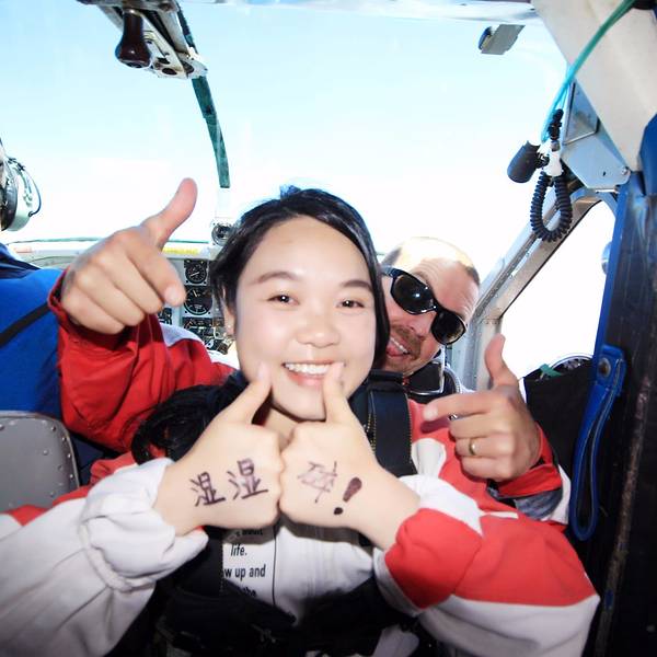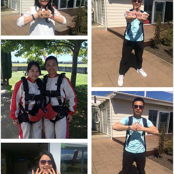 滑翔机缓缓起飞,20分钟后,教练带着我跳出飞机的一刻,我们终于在Abel Tasman完成人生第一次高空跳伞!足足45秒的自由落体的快感完全无法用言语去表达,那一刻你脑袋里根本不会去想其他东西,只想好好感受这种极速下坠的反冲将自己身体抬起的奇异体验!人生能有几次机会可以从接近4000米高空俯瞰蔚蓝的塔斯曼海,那一刻的感动,只想告诉全世界,此刻的美景只应天上有,美呆了!跳伞之前例行看安全录像后,可以在自己手上写上有趣的文字,在高空上可以对摄影师展示。