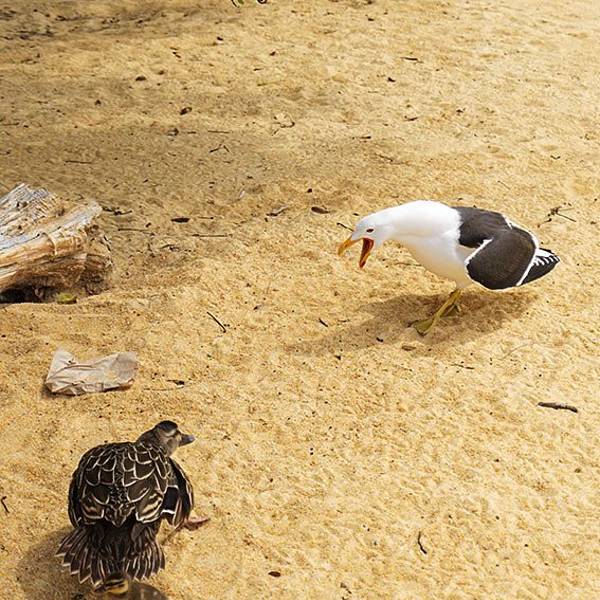 就在我们感慨母爱伟的同时,同样为了食物的鸭妈妈又开始对鸭宝宝恐吓了,但是鸭妈妈不会吓嘴,只是吓它。而其他的海欧和野鸭是真的会吓嘴。新西兰本土的海欧出现,体型大,叫声大,凶猛,它一出现所有鸟禽统统退下。