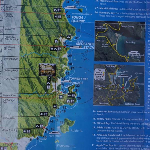 官网:http://www.doc.govt.nz/parks-and-recreation/national-parks/abel-tasman/黄线标出的是乘坐Sea Shuttle(需要提前一天在信息中心预定)进出的路线和地点;
