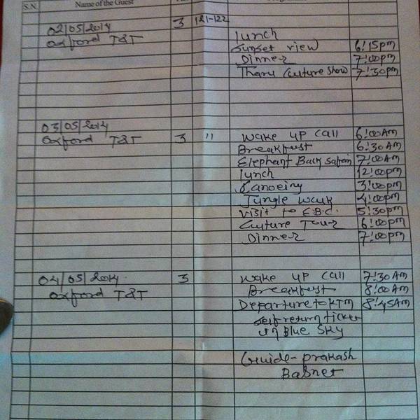 奇特旺的旅行今天就要结束了,时间虽然很短,但回快起来这段时间还是很美好的。 吃的不错,睡的不错,住的环境不错,玩的也感受到了以前没有的东西,也不错,当然这里人的更不错,这个国家的人都不错,我们把我们带来的老干妈送给了我们的导游还有餐厅的服务员,但是他们好像不是特别能吃辣,但是他们也感觉到了我们要表达的善意; 今天吃过早饭,导游会带我们去附近的当地人家里看一下,其实我们之前自己也已经都看过了,我们还是去了,就当练习一下英语,哈;环境对于语言的影响太大了,这是我出来这次的一个小感受,就这几天的时间我感觉我的语言能力都有提高了,这也难怪有条件的人会把孩子送到国外去教育,最起码的可以多掌握一门语言。 参观完当地人的生活我们就要收拾行李让导游把我们送到车站了,感谢这短短的时间他们的接待,这种东西只能自己去感觉,它和国内的接待会有不一样,有什么不一样,可以自己去感受;我们将继续搭乘Blue sky,用五六个小时的时间,颠簸回到加都。