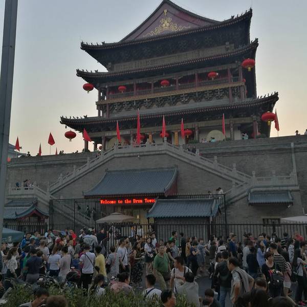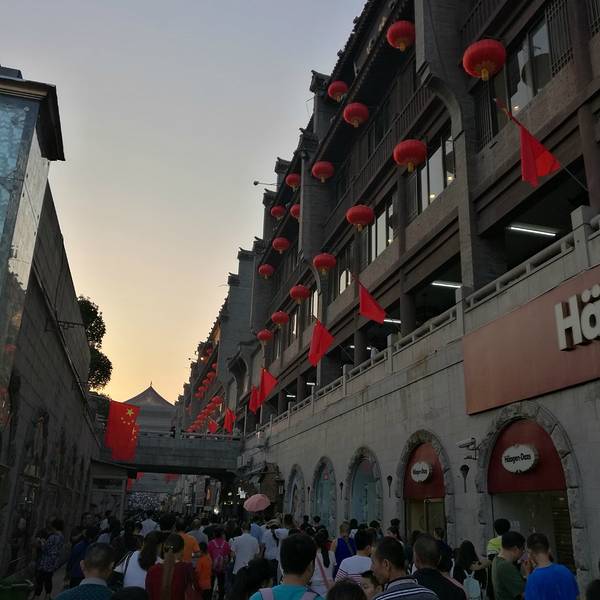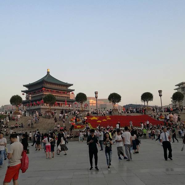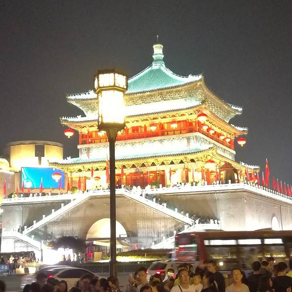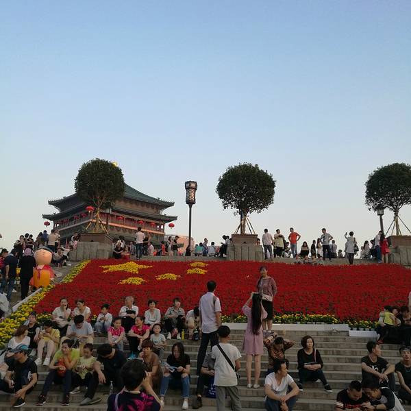来西安的小伙伴,我强烈建议多花点时间在这里走走,逛逛,我来西安的短短3天里,来这个地方不下3次。特别是晚上,钟楼的亮化非常的漂亮,是西安的一大景了。国庆期间,还用鲜花摆放出国旗的图案从钟楼往鼓楼的方向看,就能看到鼓楼了,相距不到300米,沿街都是仿古式街道建筑,楼下都是小店国庆期间,这条街人流涌动,非常的有人气。走到鼓楼有个台阶上去,走上面,屋檐下都是卖工艺品的小店,看看也很有意思屋檐下,还有2个著名的百年老店“德发长”和“同盛祥”,饿了的话,就近解决肚子问题,还可以品尝美食。鼓楼的下面就是著名的回族街,也是西安著名的小吃、工艺品一条街。可以顺道去逛逛。