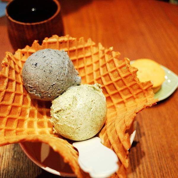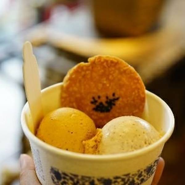 人均消费:30元从鼓楼的回民街入口走到底,便能看到这家冰淇淋店,古色古香的牌匾,飞檐翘角,十分夺目。现在过来已经没有前段时间那么火爆了,不用排队,直接进店点餐食用。一楼装潢以暖色调为主,暖黄色的灯光懒洋洋的散开,木质桌椅增添了几分古朴的味道;上到二楼,马上又进入了现代化的环境,宛若穿越古今,三楼开放式空间,可以远眺西安城景。入店,先在收银台处点单付款,在拿到冰柜取餐。2味1配料25元,4味3配料45,6味5配料60,额外搭配一份黄冠4元,外带可以买冰酪分享筒600克99元。他们家的口味都取自陕西的特色:传统醪糟,油泼辣子,中华豆腐,回坊咸蛋黄,佳县红枣,黄龙核桃。。。冰酪的用词也可以说是很特色了,兴起于唐宋时期,是中国最早的冰淇淋。选了45的套餐,搭配传统醪糟,油泼辣子,海苔,芥末,配料南瓜籽瓦片,杏仁瓦片,以及盐岩核桃。油泼辣子味不仅陕西特色十足,而且口感惊艳,深谙油泼辣子的精髓,入口就散发着油油的感觉,香辣满满萦绕于唇齿间,说不出的奇妙,绝对是要大力pick。醪糟味第二,醪糟就是米酒,用冰淇淋来吃,体验还是很奇妙的,酸酸甜甜,醪糟味纯正而浓郁,还能吃得到粒粒醪糟本尊。海苔味紧跟其后,中规中矩间又不乏惊喜,不喜好甜食星人的最爱,口感中还能感受到碎碎的海苔,颜值与口感并存。