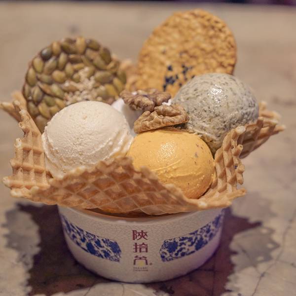 拾叁寓意西安的十三朝古都历史底蕴,于是冰激凌用了唐朝那么古意的名字改叫“冰酪”,配料里加的那块圆圆的…