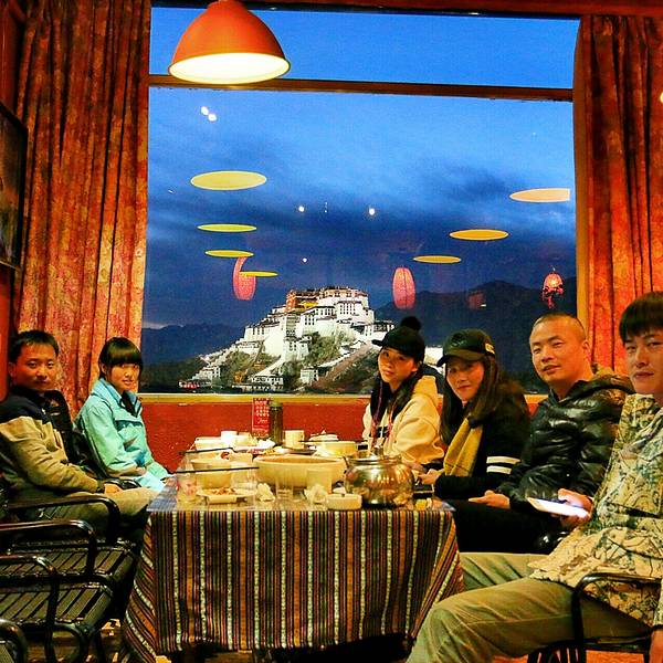 他说走走,接着带我去了一个美丽的楼顶。在这里可以将大昭寺与布达拉宫尽收眼底,远处的色拉乌兹山,