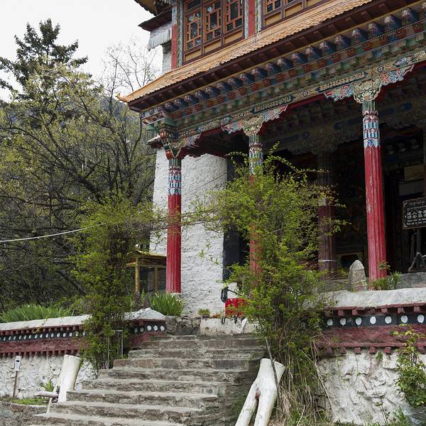 庙内主供莲花生,在一尊大威德金刚塑像脚下,有两块天然鹅卵石上面有一凹进的圆窝,传说是格萨尔王征战此地时战马留下的蹄印。另外在这个不大的小岛上的其他地方,也密布着许多神奇传说:格萨尔王挥剑于石头上留下的剑痕、树叶上有自然形成的藏文字母的“字母树”、松藏干布在石上留下的足印、莲花生洗脸的神泉……林林总总让人不由得对这充满神迹的小岛顿生景仰之心。巴松措的空心岛上有唐代的建筑“错宗工巴寺”,是西藏有名的红教宁玛派寺庙,建于唐代末年,距今已有1500多年的历史了。错宗寺为土木结构,上下两层,殿内主供莲花生、千手观音和金童玉女。寺南有一株桃和松的连理树,春天时,桃花与青松相映,煞是好看。