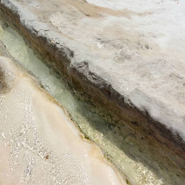 白白的岩石,温温的流水,这是我对棉花堡的第一印象。想要进入棉花堡景区,必须要拖鞋。但是棉花堡是岩石群,脚下是各种不知名的小石头,所以走上去是很咯脚,甚至有些疼痛的,加上各种火山泥和流水,所以石头是非常滑的,走路是一定要小心,小心!尽管道路艰险,但是并不能阻止我们的前进。越往前走,人越少,景色也就更美!