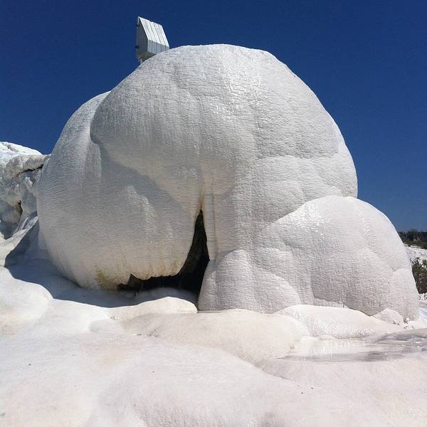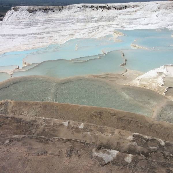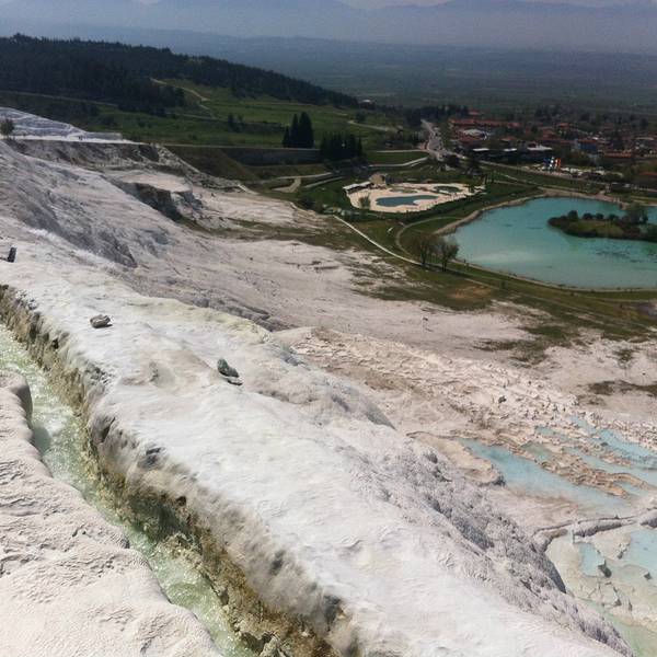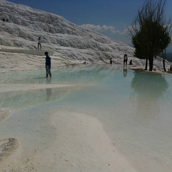棉花堡真的是,亮瞎啦,从空降DenizliI机场就开始期待这个纯白世界到底啥样,四人从机场包车前往,共100里拉,一直送到山顶入口处,据说可以搭机场大巴到Denizli再去棉花堡。棉花堡票价25里拉,赫拉波利斯遗迹也包含在内,我们当天早上到的很早,买完票进去一路上并没有什么游客,天气很好,洒水器还在给花花草草浇水,坐在白色阶梯最上面的平台上,吃个冰淇淋,看看远处的雪山,和脚下的钙化堤,以及远处水池边的比基尼美女,挺有意思。白色钙化堤上是不允许穿鞋的,但是真的很硌脚,想要用脚丫子征服这片雪白的阶梯,最好的选择就是穿双袜子,墨镜也是必须得,在晴朗的6月走在一片雪白的钙化岩上是一种怎样的感受,那就是眩晕。走累了,在温泉里泡泡脚,做个矿物泥spa