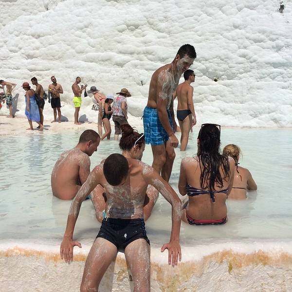 实用 走累了,在温泉里泡泡脚,做个矿物泥spa棉花堡真的是,亮瞎啦,从空降DenizliI机场就开始期待这个纯白世界到底啥样,四人从机场包车前往,共100里拉,一直送到山顶入口处,据说可以搭机场大巴到Denizli再去棉花堡。棉花堡票价25里拉,赫拉波利斯遗迹也...棉花堡真的是,亮瞎啦,从空降DenizliI机场就开始期待这个纯白世界到底啥样,四人从机场包车前往,共100里拉,一直送到山顶入口处,据说可以搭机场大巴到Denizli再去棉花堡。棉花堡票价25里拉,赫拉波利斯遗迹也包含在内,我们当天早上到的很早,买完票进去一路上并没有什么游客,天气很好,洒水器还在给花花草草浇水,坐在白色阶梯最上面的平台上,吃个冰淇淋,看看远处的雪山,和脚下的钙化堤,以及远处水池边的比基尼美女,挺有意思。白色钙化堤上是不允许穿鞋的,但是真的很硌脚,想要用脚丫子征服这片雪白的阶梯,最好的选择就是穿双袜子,墨镜也是必须得,在晴朗的6月走在一片雪白的钙化岩上是一种怎样的感受,那就是眩晕。走累了,在温泉里泡泡脚,做个矿物泥spa 展开