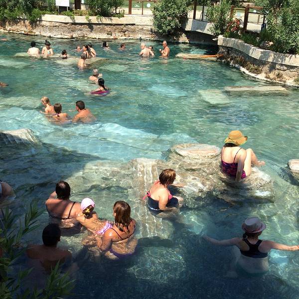 棉花堡整个景区是非常非常大的,与其说它是一个景区,不如说是一个休闲度假的地方。在棉花堡景区,除了欣赏美丽的石灰岩构成的自然美景,还一定要去泡一泡这古温泉池水。之前在《花样姐姐》中,林志玲就曾经在这个古温泉中游过泳。的确,这里的游人更多,但是以老外为主。可以真实体验一把古代贵族洗澡,泡温泉的真实场景。泡一次温泉的价格是100元人民币一次,不是很贵。性价比还是非常不错的。这次去旅游很遗憾没有来古罗马浴池体验一把,以后有机会一定要来体验一下。当然,棉花堡景区很晒,一定要做好防护措施,另外最好要多带一些水,那里的水很贵。 展开