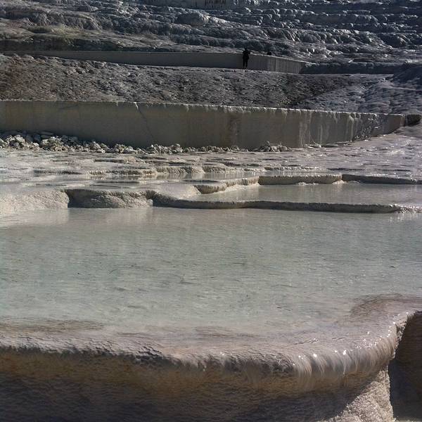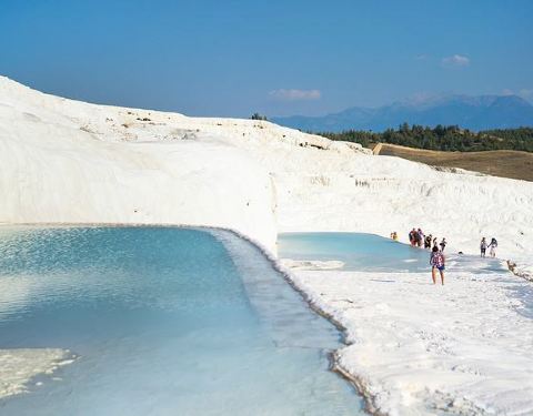 进入棉花堡温泉池要先赤脚行进250米才能到达上方平台,玉一样的半圆形白色天然阶梯层层叠叠,犹如雪砌的梯田,远看像大朵大朵的棉花矗立在山丘上,无数涓涓细流从丘岩间的缝隙潺潺流下,温热的水蒸气让棉花堡氤氲在淡淡的缥缈雾气里,泉水积在台阶之间,形成一汪汪波澜不兴的水池,这便是有世界七大奇观之誉的土耳其棉花堡。从远古起,土耳其温泉就闻名于世。