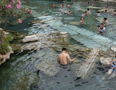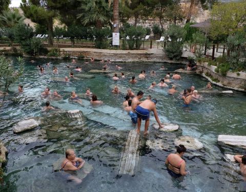 ...是游客都争先恐后的下去泡澡,因为这里不仅是处于棉花堡的范围之内,而且水池里面还有一些古代的石头