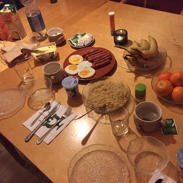 结账的时候pos机出了问题,还好我们带着现金,所以,虽然北欧几乎所有地方都可以刷卡,但是出门身边现金还是需要备一点,以备不时之需。出发之前,和大家伙儿合照一张。洗了出来分给每人一张,屋主帅哥说,要贴到墙上,以后搜集更多的来自全世界的合影。一切搞定,收拾好行李,检查妥当,继续出发!今天走的路线并非国道,而是市际公路。两边的景象跟昨天大同小异,一排排的针叶林,树上鲜有积雪,路边的围栏和标杆都消失不见,更加有一种远离城市深入大自然的感觉。 展开