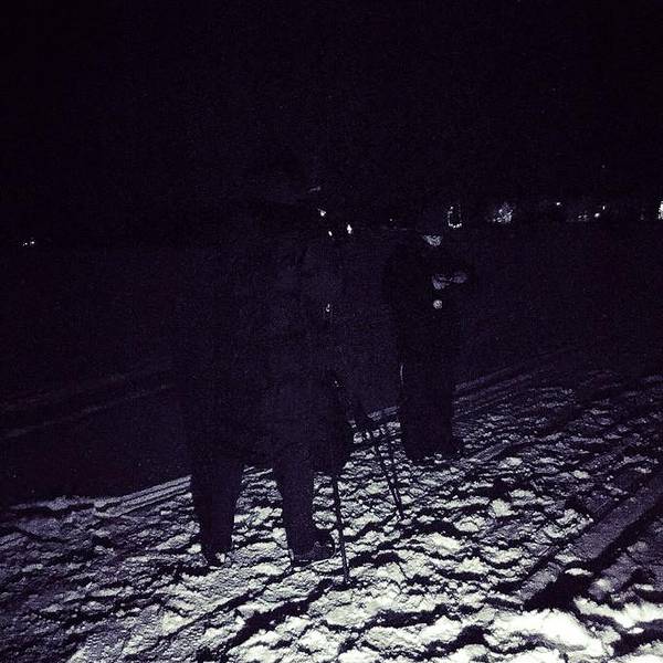 1個多小時的車程後,領隊帶我們來到一片漆黑只有月光照亮的結冰湖面上,踩著深到小腿的積雪,往湖中央去,在-6度的天氣下靜靜等待極光的出現。