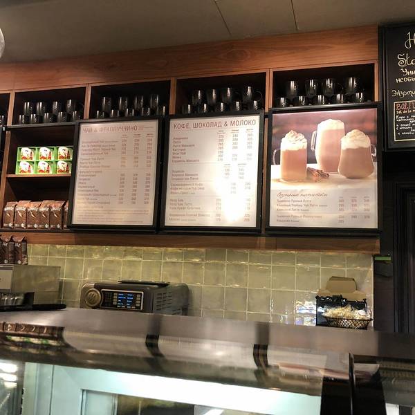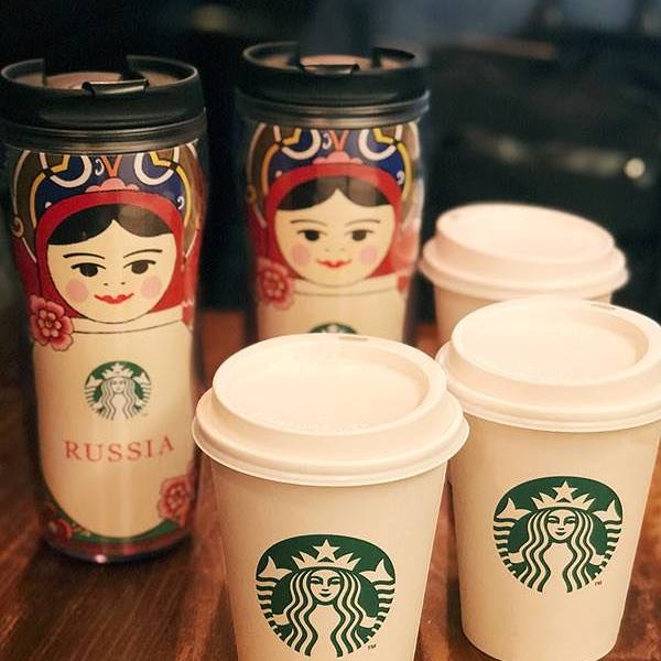 下一站是红场附近,四季酒店正门对着的——猎人商城(下沉式地下商场),这里有一家非常大的 Ривгош(俄罗斯化妆品连锁Top2的另一家)。 Tip:之前提到的2家化妆品如果不会打俄文,谷歌或者百度“化妆品”,大部分结果都是他们2家~猎人商城里有一家KIKO专卖!貌似很有名,里面好多妹纸在买唇膏! Ривгош走了一圈出来,价格很不美丽。买了少量的护肤品,准备去圣彼得堡再看看。星爸爸打卡!四季酒店附近的这家装修风格,和国内的还是很像的。每个座位边上居然都有暖气片。全部俄文。备好英文点餐吧!背景很有喜感的随手杯,我们人手入了1~2个~950卢布小的,900卢布反而是大的。