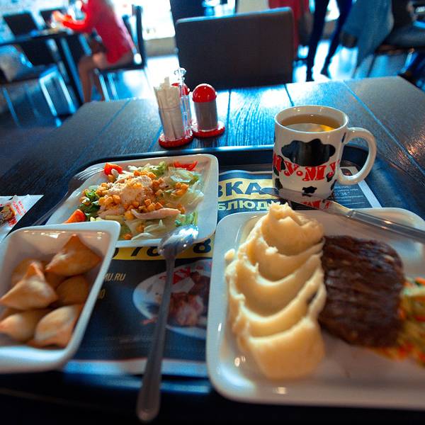 ...中一个入口,进去就是最有名的自助式快餐My-My,俄语发音“木木”,虽然觉得牛叫应该是“哞哞”