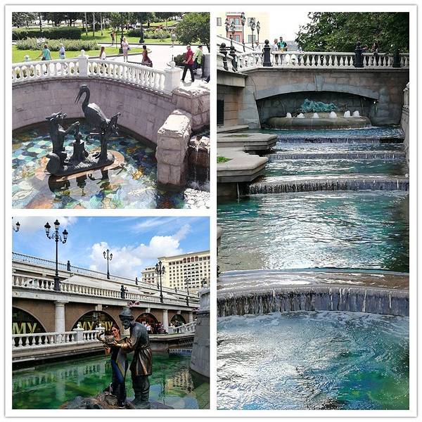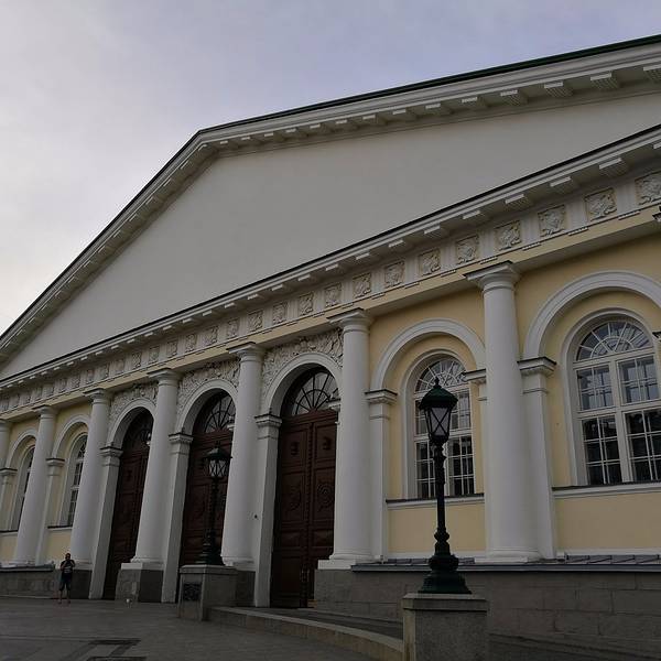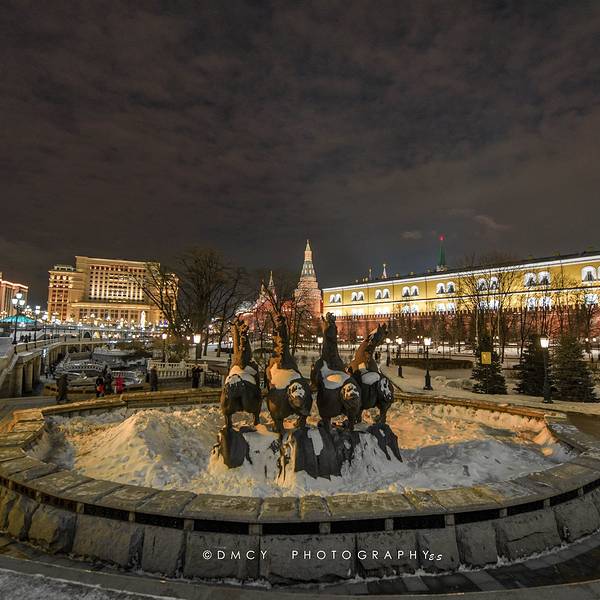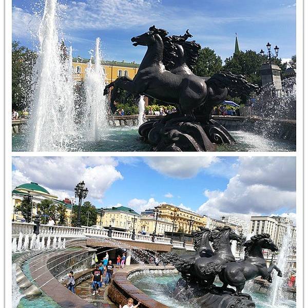 在无名烈士墓对面就是猎人商行,这是一个大型购物中心,有“金拱门”(麦当劳)、mymy等餐厅,可解决大家的午餐需要。在猎人商行和亚历山大花园之间有一条叫叫涅格林纳亚的人工小河,这条小河上面放满了雕塑。我们看到普希金笔下的渔夫和金鱼,还有像童话故事的熊和狐狸,仙鹤,鸭子等。再往前走,我们就会看到一座设计得很别致的喷泉。这座喷泉的主体是一个四匹骏马雕塑的大型喷泉,四周还有一些小型的喷泉组。这些喷泉都是由著名设计师设计的,并且都有自己的名称。主喷泉名叫“盖泽尔喷泉”(其实,“盖泽尔”也就是喷泉的意思),也叫“四季喷泉”——四匹骏马代表着一年的四季。四季喷泉的后面还有“帘幕喷泉”、“丝雨发散”等等小型喷泉。看完四季喷泉,我们沿着楼梯上去,到了练马场广场(也称马涅什广场!?),这里曾经是沙皇的训马厅,这里有中央展览馆,还有一组时钟喷泉(我去时没做到这一个景点的功课,所以错过了,回来写游记时看到别人的记录,发现挺有特色的,它就是猎人商场的屋顶)。