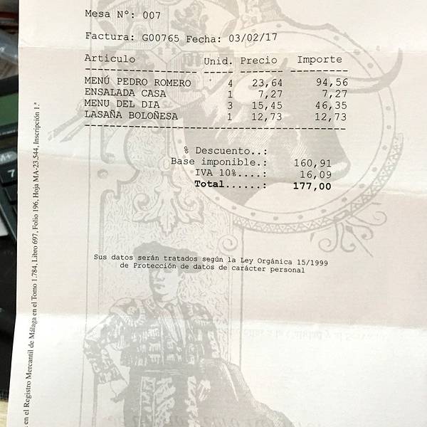 推荐指数:★★★ 环境复古而华丽,服务员彬彬有礼,能讲一口流利的英文。招牌菜炖牛尾,说明一下,并非推荐,这是去过龙达的游记都会推荐的,我们亲自试过,贵是挺贵的,可惜问一些当地人都没有推荐,基本都是做游客生意,味道是中国人口味吧,个人感觉跟我们平常吃的牛尾汤里煮烂的牛尾没啥区别,所以见人见智了。肉酱千层面味道也一般吧,煮得太烂了。炖牛尾17.27欧,肉酱千层面12.73欧,税3欧。账单好漂亮。