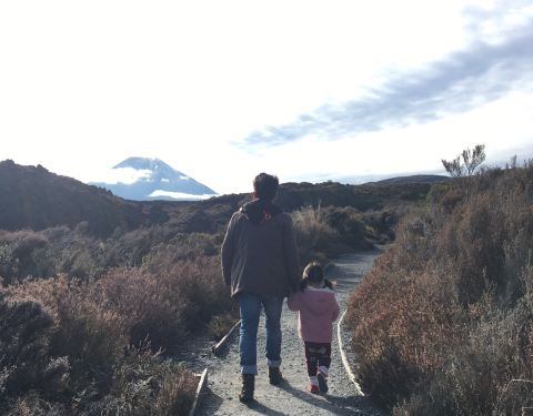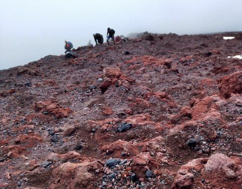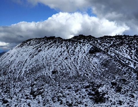 瑙鲁霍伊,传说中汤加里罗峰的老婆,山型优美,远望微红的山顶、如折叠裙般的雪痕,是汤加里罗1日最短线上能望见的最高峰(常被误以为是汤加里罗峰)。在汤加里罗徒步线上有个分支线可以攀登瑙鲁霍伊峰,但坡度陡、全沙石,难度颇大。峰顶岩石温热,热气缥缈,有部分石块滚烫,滋滋地喷着细水珠,得保持距离注意安全。天气好的话,峰顶可以看见北岛最高峰_鲁阿佩胡。