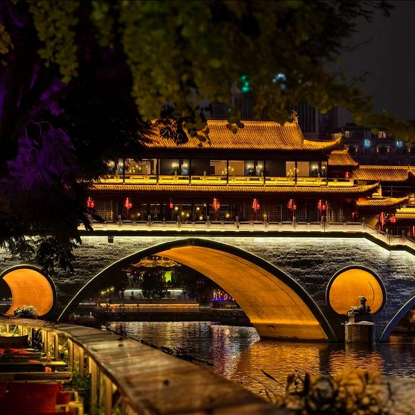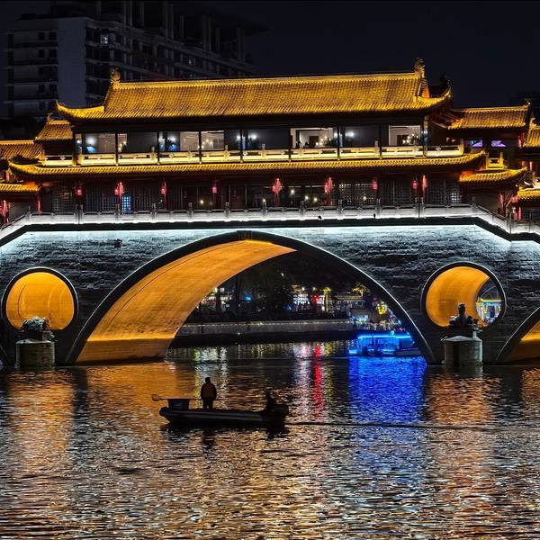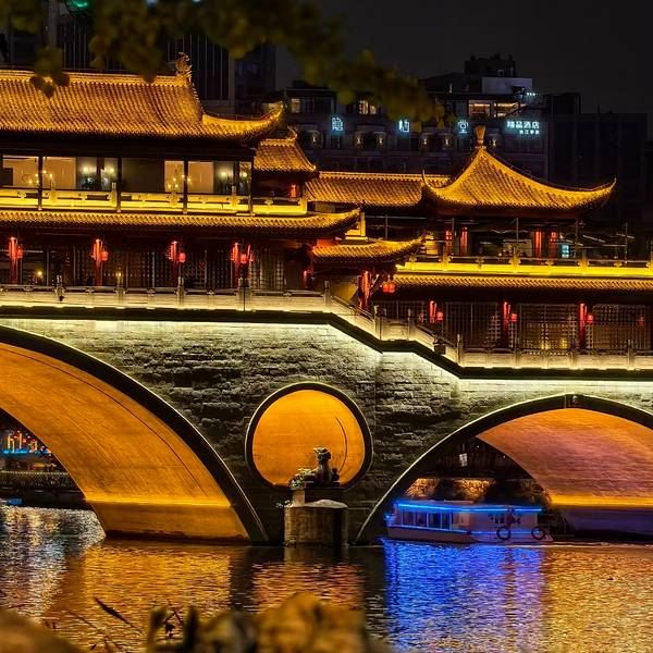 府南河本身不是什么旅游景点,但成都著名的安顺廊桥就在府南河上,绝对是值得夜游的地方府南河是岷江流经成都市区的两条主要河流府河、南河流经合江亭后合为一条河的合称,是成都市的母亲河,虽然近些年官方一直称作“锦江”,但仍然是老成都人心中慢慢的回忆。府南河在1997年经过整治后至今水质都不...府南河是岷江流经成都市区的两条主要河流府河、南河流经合江亭后合为一条河的合称,是成都市的母亲河,虽然近些年官方一直称作“锦江”,但仍然是老成都人心中慢慢的回忆。府南河在1997年经过整治后至今水质都不错,河面不宽,曲曲折折的绕着成都市区,河岸两边绿化很好,有树有花,沿河漫步风景独好,是很多成都市民晨练的必去之地。府南河本身不是什么旅游景点,但成都著名的安顺廊桥就在府南河上,绝对是值得夜游的地方。安顺廊桥有着悠久的历史,最初的建筑踪迹可以追溯到元代。在马可•波罗的游记中,安顺廊桥是他印象中较为深刻的四座大桥之一。现在看到的是在2003年设计修建的了,得以恢复其大致的原貌。由于安顺廊桥的夜景非常美丽,也曾经出现在成都的城市旅游宣传片中,频繁地出现在大众的视野中,名气和熟悉度也远远高于九眼桥,也让很多人因此去安顺廊桥打卡拍照,欣赏这令人沉醉的夜景风光。一到夜晚,桥上的霓虹灯光亮起,整座桥就成为河上最耀眼的风景。明代风格的廊桥在暖黄色灯光的映照下显得别有韵味,彰显出了成都这座历史文化名城的浓郁内涵。半圆形的桥洞与水中的倒影相互映衬,组合形成了一个完整的椭圆,好似模糊了虚与实的界限。安顺廊桥至合江亭仅有300多米,又地处于市区2环内,两处景观夜景超赞,四周点点灯火和古建轮廓倒映河中非常漂亮,适合夜游。附近1公里左右还是成都酒吧汇聚地九眼桥,是成都夜生活的代言地。 展开
