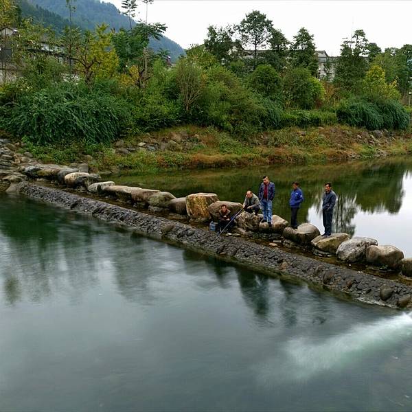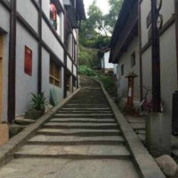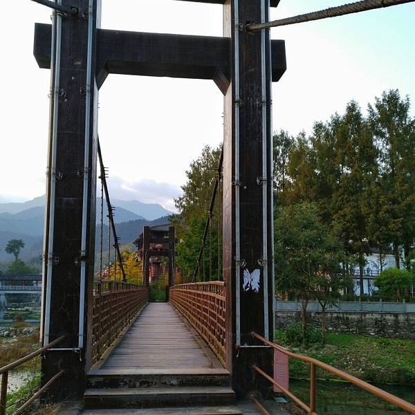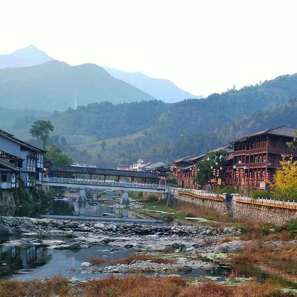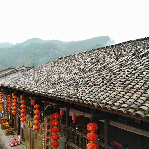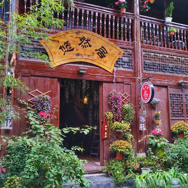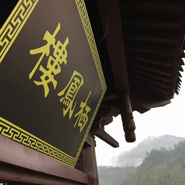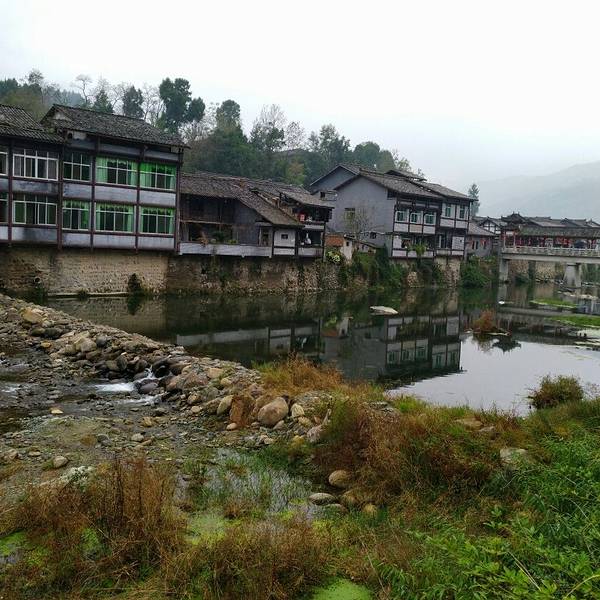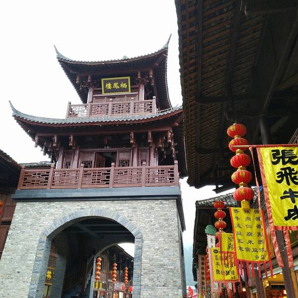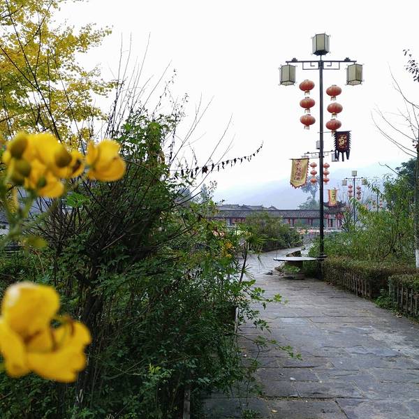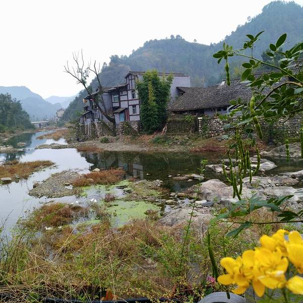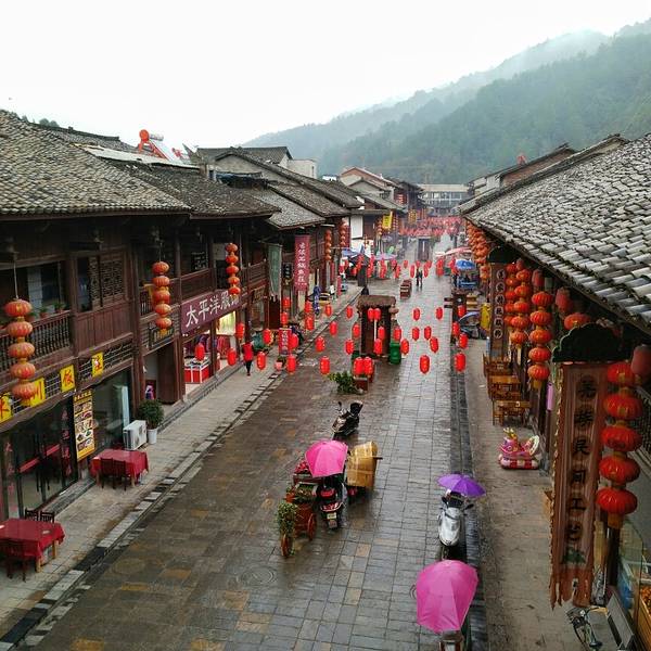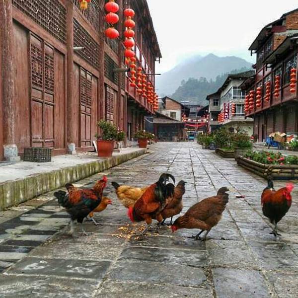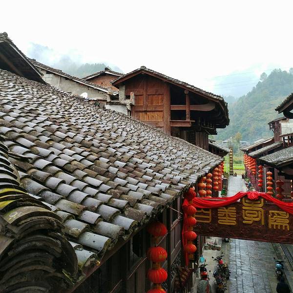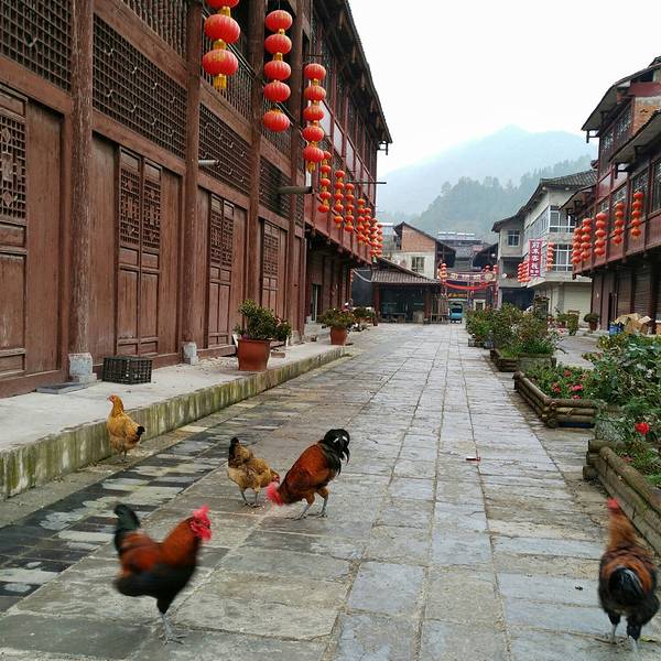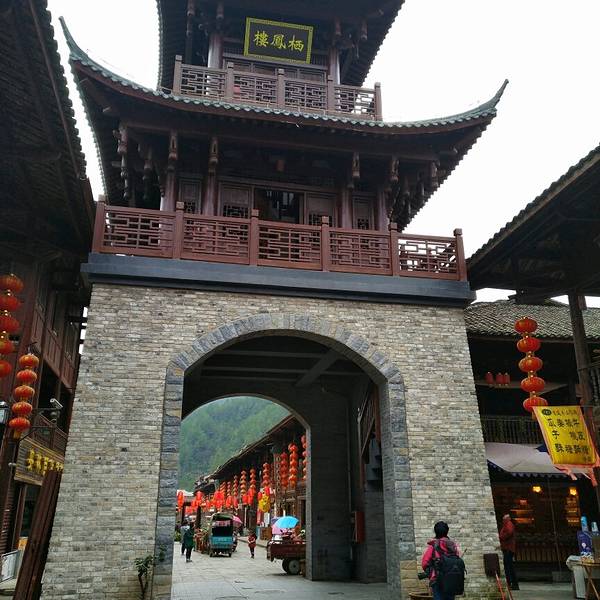 楼叫“栖凤楼”莫不是这里有什么传说……这个楼有三层,楼上有迴廊,站在上面下面的景致一览无余,黑...一觉醒来天已经亮了,隔窗而望好一派田园风光,急匆匆跑下去看风景,小妹说她还要再睡一会儿,还说要是下点小雨就更好了……我下楼来看看酒店里的青木川的地图就出了门,没走几步就真的下起了零星小雨,都是小妹...一觉醒来天已经亮了,隔窗而望好一派田园风光,急匆匆跑下去看风景,小妹说她还要再睡一会儿,还说要是下点小雨就更好了……我下楼来看看酒店里的青木川的地图就出了门,没走几步就真的下起了零星小雨,都是小妹念叨的,下点小雨好啊,古镇的青石板就有了积水会有倒影出现,还会起雾……但是可不要下大呦,我又回到房间穿了件冲锋衣,告诉小妹下雨了。出了酒店就看见几只小鸡在啄食,远处的山被轻雾弥漫着,几棵金黄叶子的银杏树就在酒店门口的小路上,不远处就是清清流淌的金溪河,河水顽皮的在河中间的大石头中间绕来绕去,村姑在河水中洗衣服……不知名的小花点缀在河岸边,对面老街的房子有着袅袅的炊烟……所有这些不就是一幅山水画卷田园风光吗。我在河边贪婪的吸允着温润的空气,空气中略有些青草的味道,这是烧柴草的味道,记得小时候去姥姥家就能闻到这种味道,可惜现在已经闻不到了,现在又闻到了不禁又依稀的想起了遥远的童年逸事……在河边转着转着有些饿了就转向新街找东西吃,新街的店铺已经开张了,五色鲜艳的货物把这古镇街道点缀的生气盎然,孩子们在街道上追逐着好开心的童年。找到了一个油条店,老板娘现炸了两根油条喝了一碗豆浆,四元五角钱真便宜!吃饱了继续逛,新街的主街是东西方向的石板铺路,路的两旁几乎都是客栈,酒家,商铺,还有作坊,南北方向有好几条小路都能通到主路上,东西南北交汇的十字街上修有一座楼,很像一座鼓楼,有两个入口可以爬上楼上,但是有一边封闭了,只有一边能上,楼梯特别的窄大概也就40公分吧,胖子都装不下,我小心翼翼的爬了上去,啊!这个楼叫“栖凤楼”。