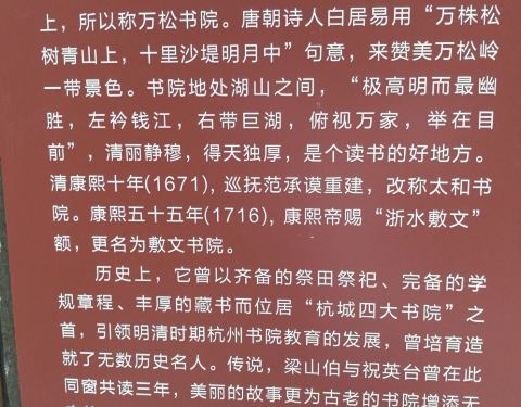 万松书院,始建于唐贞元年间(785-804),名报恩寺。明弘治十一年(1498),浙江右参政周木改辟为万松书院。明代理学家王阳明曾在此讲学。清康熙帝为书院题写“浙水敷文”匾额,遂改称为敷文书院。现遗址尚存有“...