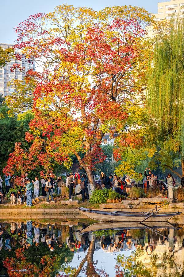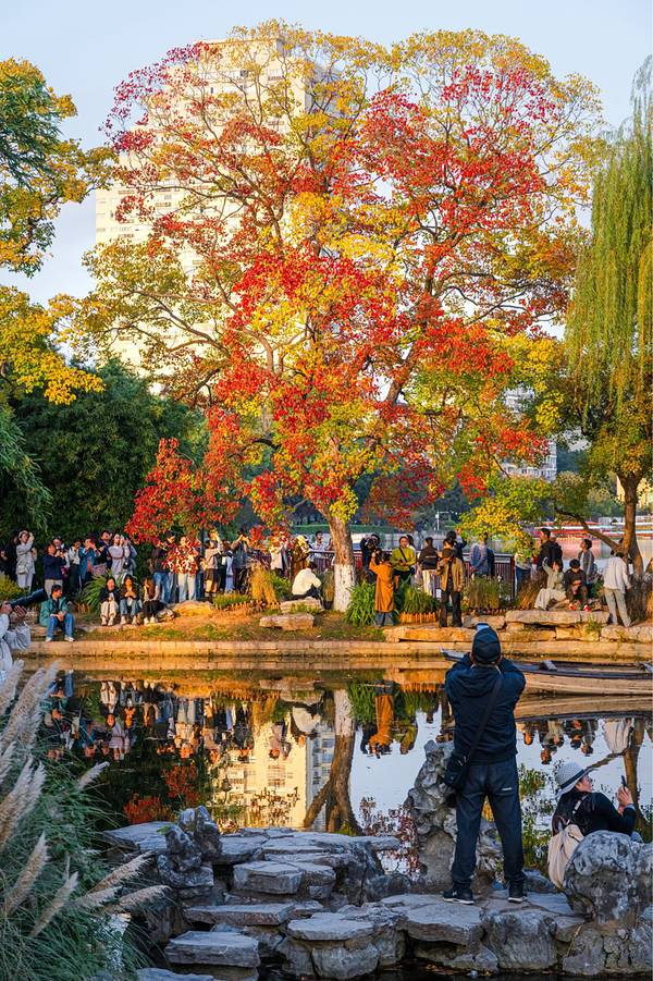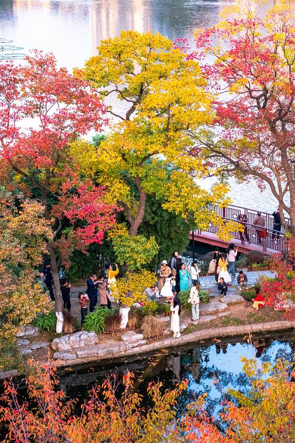 - 前湖的月牙堤就好似一幅“泼彩油画”,这里的乌桕更为壮观,沿着弯曲的堤岸生长,背景有前湖和明城墙,视野开阔,真是拍照的绝佳地点。
