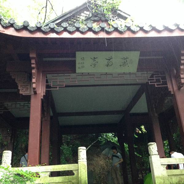 中山公园这个景点,在西湖边上不是很有名气,不过确实很有特色。最早是乾隆皇帝的行宫,现在建筑已不复存在了,只留下很多基础和遗迹,都用玻璃罩扣着。大门对面有个牌坊,上书“光华复旦”四个大字,取自《尚书》,原来是行宫的牌坊。进到里面有个“孤山”的影壁,据说是宋人的遗迹,比较著名的景点“万菊亭”,西湖天下景等处,在细雨中漫步欣赏,人不是很多,看起来心情都很陶醉了,大门两侧,有几个小店,有一处卖书、明信片、茶具等很有点意思。其余两、三家卖得都是不值钱10元一个工艺品。