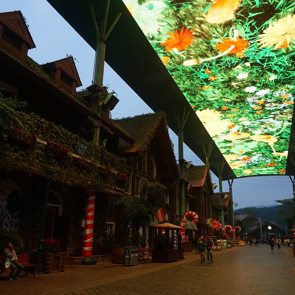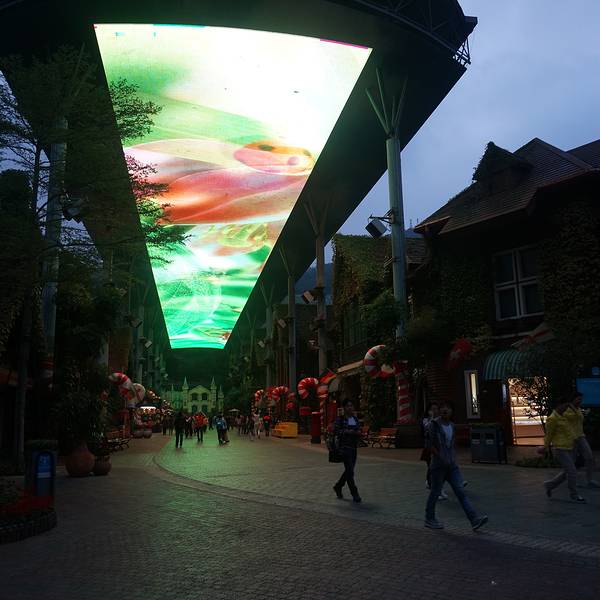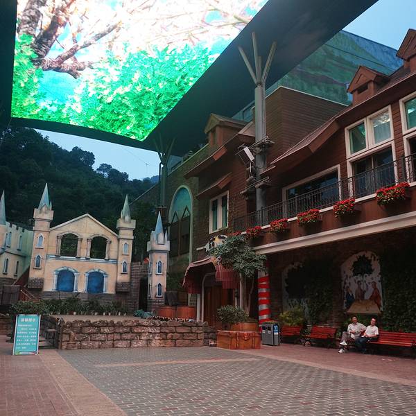 最美的风景永远在路上,选一种姿态,让自己活得无可替代。走在一条美丽的小镇上,沿路遇青绿……吃饱喝足,我们带着相机继续上路,小镇商业街内设有天幕,据说是LED屏,每天会播放不同内容的影像,并配合环绕立体声音响,效果很是震撼。