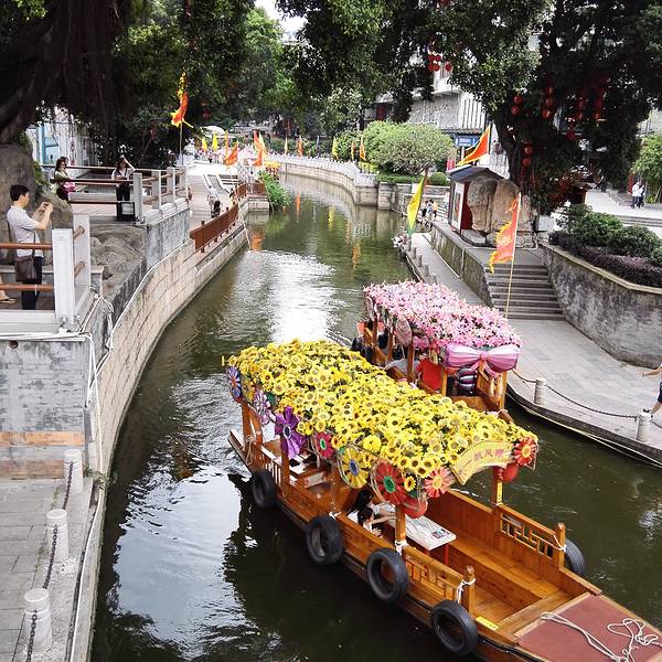 荔枝湾涌是广州一个知名景区,曾有古诗写道“一湾溪水绿,两岸荔枝红”,这句诗描述就是荔枝湾涌。古时候,这里的水乡美景曾是岭南第一景,也是荔湾艇仔粥的发源地。重建开发之后,荔枝湾重现了岭南水乡的风情。 荔枝湾涌位于广州市荔湾区西关泮塘一带,是西关涌和荔枝涌几条河汊的总称。游玩的方式可以随意逛逛散步或者是坐荔枝湾游船。从泮塘路进入,沿着河涌游逛,在文塔广场和梁氏宗祠门口可坐荔枝湾游船游览,在船上可品茗和品尝广东点心。可以看两岸富有岭南特色的建筑风格。在文塔一侧有旅游咨询中心。 如果你选择随意走走,你可以沿着恩宁路看着那古旧的建筑,一直看到那桃红柳绿的荔枝湾涌。然后在河边买上一份泮塘五秀之一的马蹄做的马蹄糕或者是马蹄爽,还可以去旁边的荔湾湖公园吃上一碗艇仔粥。