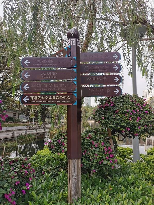 请看这个路牌就非常清晰了,左边梁氏祠,右边公园南门,温馨提示下:我拍的荔枝湾这几个大字是在左边...接下来终于走到了大名鼎鼎的新荔枝湾,梁氏宗祠这边的范围比较小,在桥的另一侧可以连通荔湾湖公园的那个范围才是精华地段,河涌两旁有各种卖小吃的,比如鸡仔饼,芝麻糖,砵仔糕等等,还有咖啡馆,西关藏宝阁