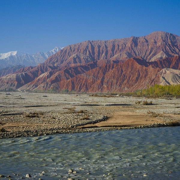 五彩山,俗称“红山”,也称为“五色山”,位于阿克陶县奥依塔克镇西南方向的314国道旁。在帕米尔高原的中低山中,随处可见五彩缤纷的山体,景观十分丰富、奇特。有时同在一个山体中可以看到黑、白、黄、红、青五彩缤纷的颜色夹杂其中,纵横交错的交织在一起。在帕米尔高原五彩山旁,雅丹地貌也十分丰富,其造型生动、形象。五彩山和雅丹地貌都具有较高的观赏价值和研究价值。 后面发现,南疆到处都是这样的地貌。红山河谷就在公路两旁,这里长达几公里全由红色山体构成的山谷,山体的颜色红得炫目、棱角分明,比火焰山的颜色还要深,所以这里又称作南疆火焰山。在红山前流过的是奥依塔克河,虽然不深,但是水流很急,滚滚而下的河水居然是灰色的。据说春夏两季河水非常大的,主要流淌着附近大山上融化的雪水,带下很多矿物质和石头,所以因此颜色变成这样。前方就是我们在新疆公路上遇到的第一个检查站