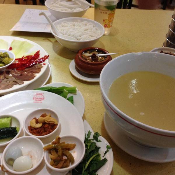 转眼又是晚饭时间了~~ 来到云南当然要吃云南著名的米线啦。 推荐:桥香园云南过桥米线(连锁老字号哟) 在金马坊旁边就有一家分店,晚餐就在那解决了。 美食的诱惑,果断上图~~
