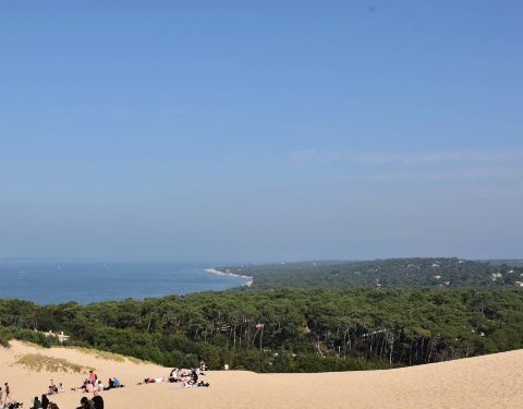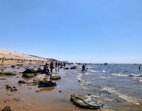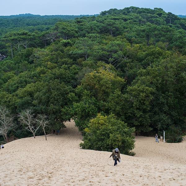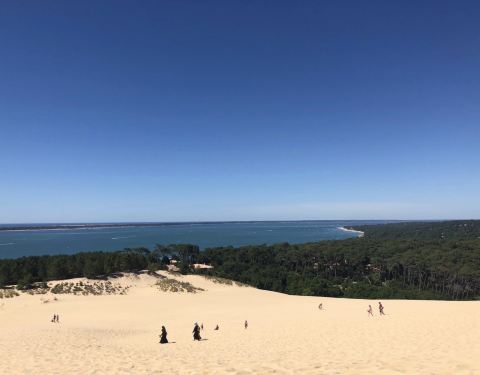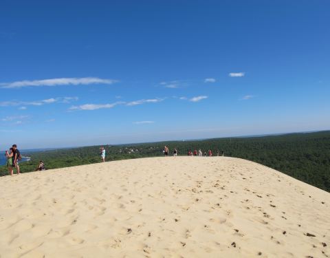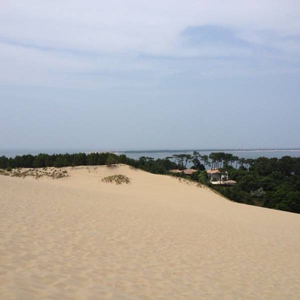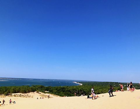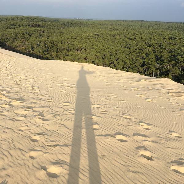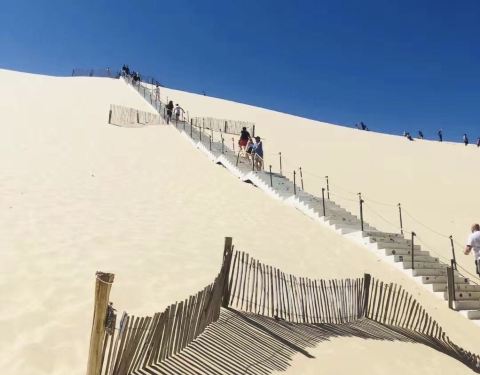 DAY 3 Arcachon第三天,我们去了arcahon, 传说中的大沙丘;波尔多到arcachon的火车也是基本一小时一班,票价5.5,车程40分钟。本来想去吃一家海鲜自助的,可惜那里和arcachon大沙丘太远,只能放弃,自驾游的同学可以考虑去下,据说灰常不错,16.9欧海鲜自助啊自助,给个地址:6 Avenue binghamton,la test de buch,店名叫做Robine crusoe。从火车站出来去沙丘是要坐公交车的,公交一个小时一班,注意时间哦,不过基本火车下来等个10几分钟就会有车了,1号线,站台在火车站出口对面,下车的站名叫DUNE DE PILAT, 下了车会有指示牌滴,车程大概30分钟左右。火车站出门旁边就是office de tourisme, 工作人员会给你1号线的时刻表,还有地图和推荐的一些活动,大家可以选择做个船神马的,可以租自行车,但是貌似租车骑到大沙丘真的很累,还是乖乖的选择做公交吧。爬沙丘还是有点累的,总觉得走一步要退半步的样子,不过爬上去了就能看到美景啦,上图。