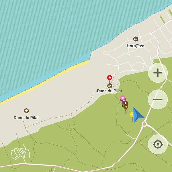 地图截图:在mapsme的地图上可以看到两个Dune du Pilat标记点,切记红色五角星为正确的地点标记,粉色五角星为停...(1)地址及基本信息介绍