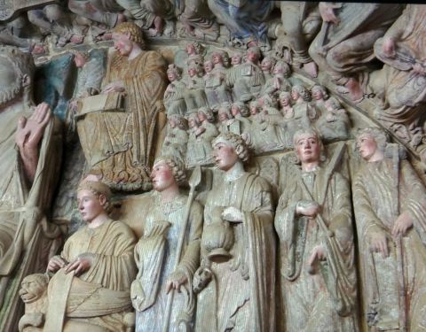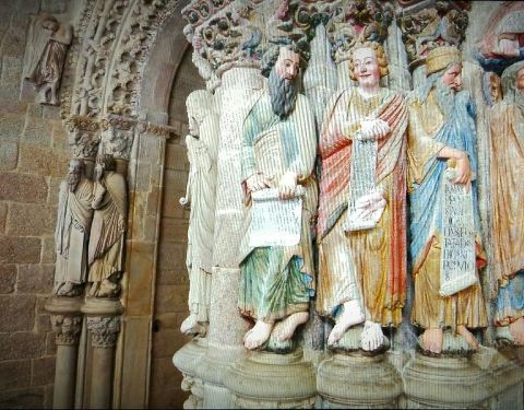 大教堂博物馆和大教堂是一体化的,高挺的部分是大教堂,沿两边排开的是博物馆,下图中隐约可见博物馆左右入口。虽然大教堂博物馆没有想象中那种精品横呈的气派,但如果你想了解和大教堂息息相关、有唇齿般关系的大师马提欧的作品(毕竟现在教堂北面维修,那些杰作你什么也看不到),那就非得参观大教堂博物馆才行。门票€6,不贵。博物馆面积很大,有四层楼,分类展出,有图书馆、大师作品挂毯(有的原作是鲁本斯、戈雅的)、马提欧的石雕唱诗台原作(1604年被毁,于近期拼补起来)、皇家万神殿等等。馆内以电视片的形式介绍的"荣耀之门"(Portal of Glory)值得你驻足认真观看,这就是大教堂北门那端维修的包括大师马提欧200多座雕塑作品的雕塑群。虽然馆内禁止拍照,但我私忱电视片截图也许不在完全遭禁之列?就从电视片里截了几张图……