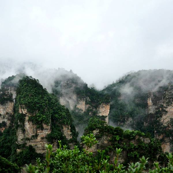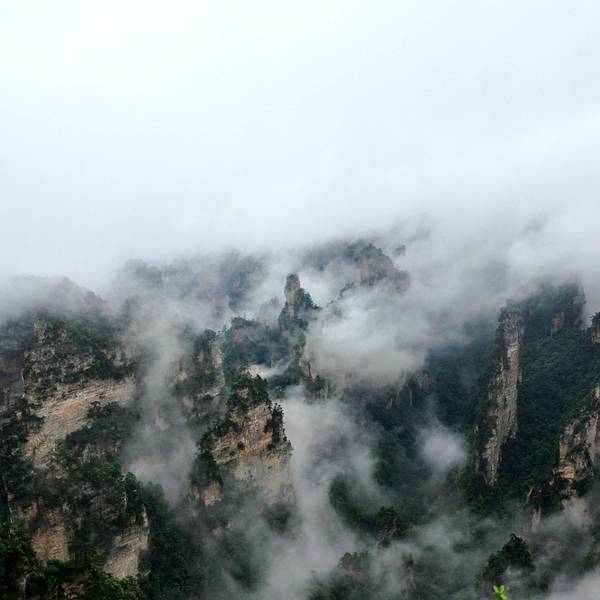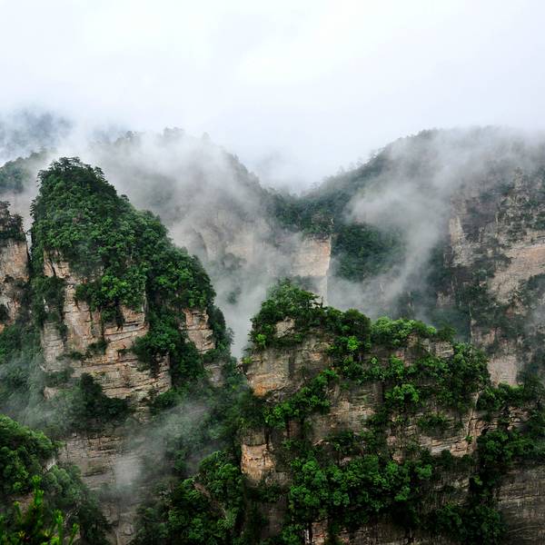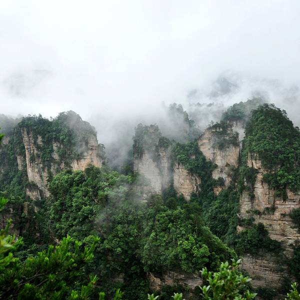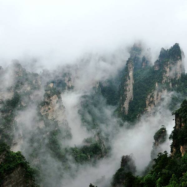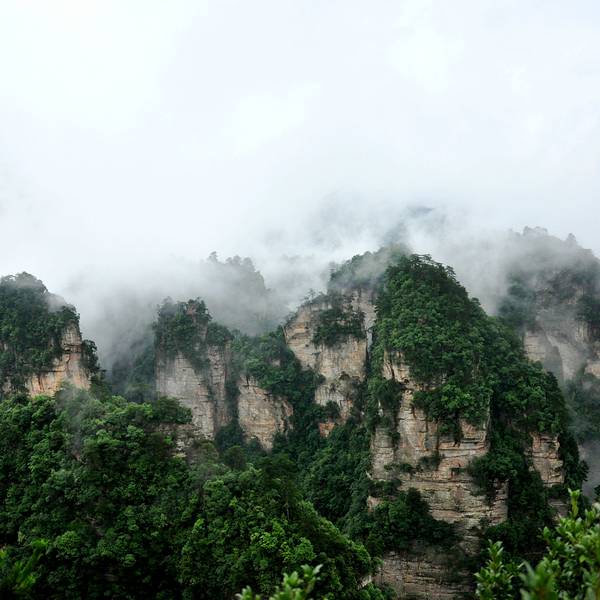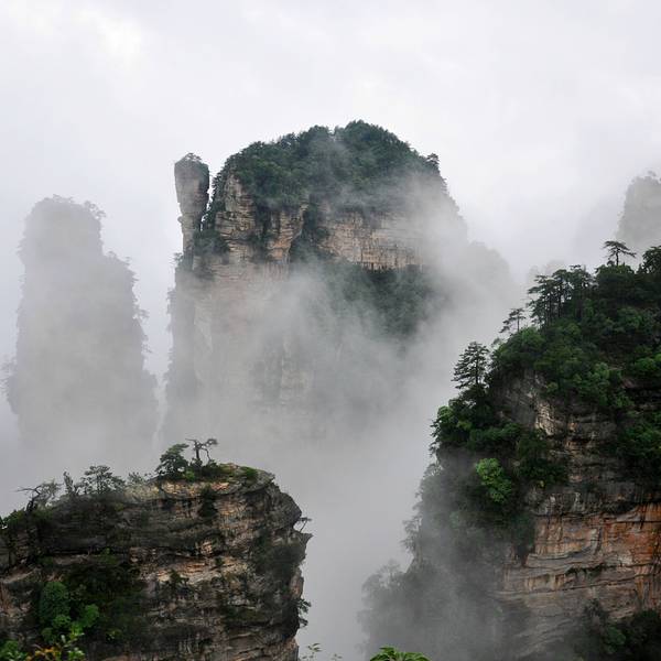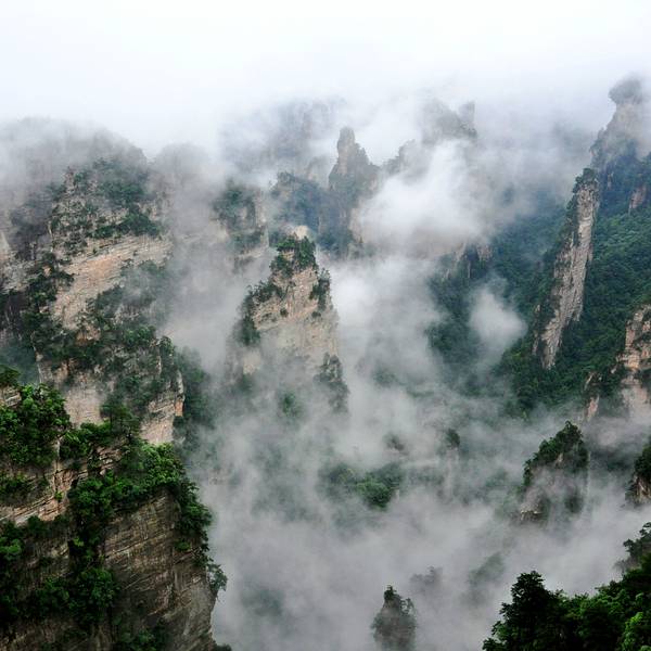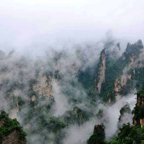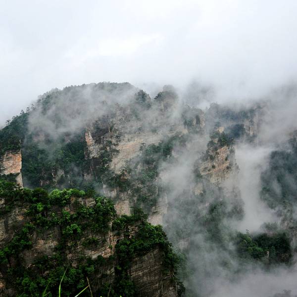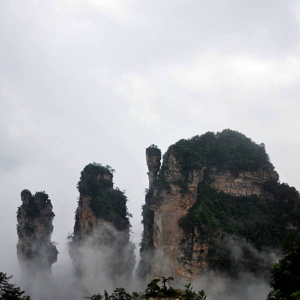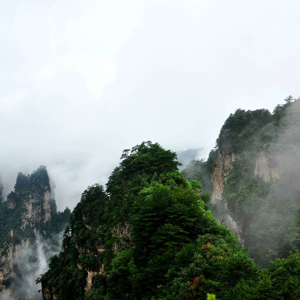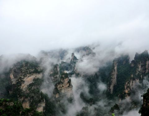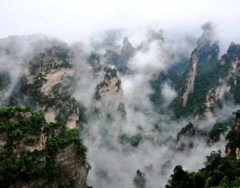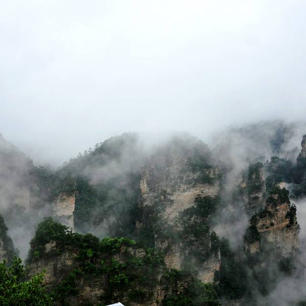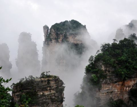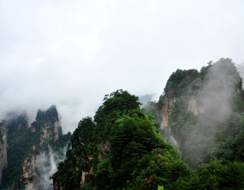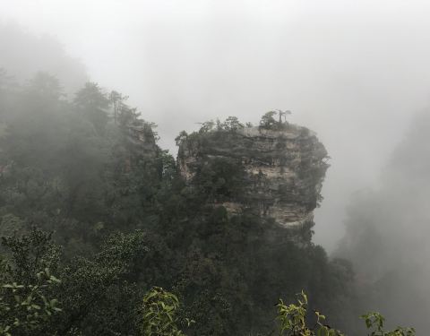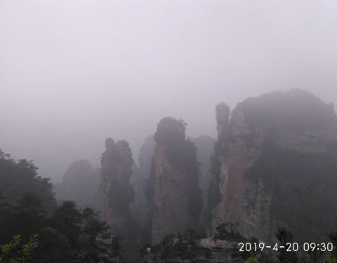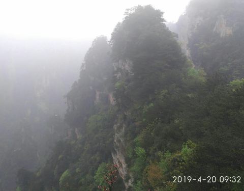 没想到等了不到10分钟,突然风来了,渐渐的把雾吹散了,慢慢的露出了若隐若现的山形,雾聚雾散速度特别快,我们赶紧抓紧时间拍照,生怕错过这美丽的瞬间。不到十多分钟的时间,雾又浓了,啥都看不见了。我赶紧看了看拍的照片,还好,拍了几张,照片中的云雾缭绕着山,感觉就像在看一幅幅水墨山水画,美如仙境……总结:一步登天位于杨家界景区内,是杨家界的最高峰。进入杨家界景区,经八里坡登山,爬上32步铁梯之后即来到峰顶。峰顶平坦,周围围有护栏,视野开阔,有“一览众山小”之感,仿佛天空触手可及,如临仙境。从这里望去,居高临下,可看见深不见底的峡谷,蔚为壮观。