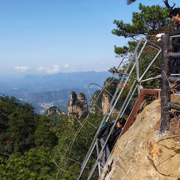 途中经过一步登天,很累,体力不好的人,慎行,要爬一段近乎九十度的垂直铁梯,大概五米,但上去后就...杨家界有两条路线可选择,我们选了去空中走廊的路,途中经过一步登天,很累,体力不好的人,慎行,要爬一段近乎九十度的垂直铁梯,大概五米,但上去后就会觉得是值得的。