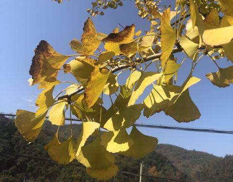 每年从11月初到12月初,杨家村都有银杏节。阳光照进树丛,微风吹起,金黄的叶片像一把把小巧玲珑的折扇,随风飞舞,很浪漫。