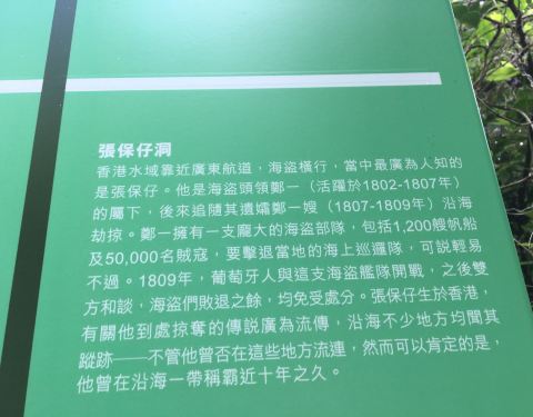 香港有多个与张保仔有关的景点,其中以张保仔洞非常为人所熟悉。张保仔是清朝的海盗,活跃于南中国海一带,据说当时他的船队有600艘船只以及5万人,主要劫掠官船或外国货船,并以劫富济贫为人所乐道。后来,清廷招安诱降张保仔,任命他为海军军官。张保仔洞位于香港离岛区长洲西南部,现已成为岛上的旅游景点。有人认为张保仔洞非常狭窄,无法埋藏宝物,所以洞其实只是用来躲避清兵追捕或放火药的地方。到这里来探险,还是带手电筒比较实际一点,因为张保仔洞内黑暗狭窄又凹凸不平,请加倍小心。
