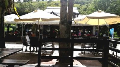 今天要安逸些,让娃们睡饱,午后包辆车游西线。出来早午餐,十来点钟的艳阳天下,旅馆对面的草地上