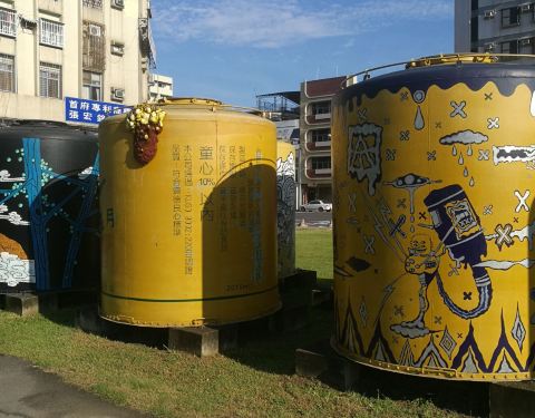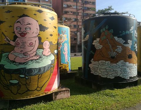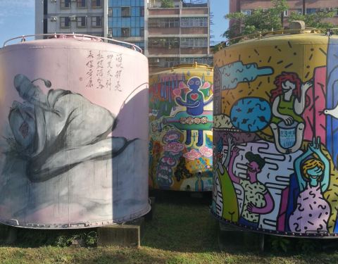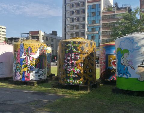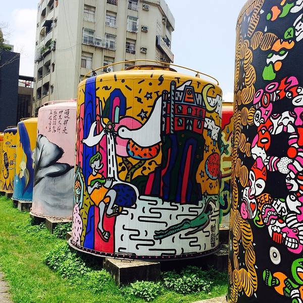 类似于北京798那样由旧厂房改建的创意园区,不过面积小的多。这里前身是台中的酒厂,所以园区里有很多酒罐形状的艺术品陈列,烟囱和酿酒车间也有保留。去时是早上,打太极和跳拉丁的老年人分别占据主楼的一块区域,互不干扰。