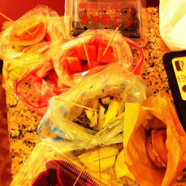说实话晚上8点以后淡水老街中正路上很多点都已经打烊关门了,但是英专路上却是热闹非凡,后来我们向酒店前台打听,淡水老街现在游客去得多,而英专路夜市都是本地人去的,英专路的入口很小,如果你要找,只要找到捷运淡水站对面的优衣库,优衣库右手边的那条小路就是英专路。英专路上大部分都是服饰的小店,小吃都是路边摊,我们买了一份盐水鸡、先切好的红心芭乐配梅粉、莲雾、红心火龙果和西瓜打包回酒店夜宵。