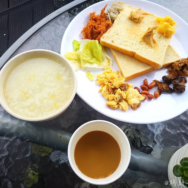 第二天早上我们计划要早起看日出云海,凌晨五点在闹钟声中惊醒。天还没亮就艰难地爬起来出门,然而看到的结果却令人心塞。阴沉沉的天,远处是大片的乌云,看不见太阳,只有从厚厚云层中透出来的一缕光。(哭)两个人有点失望地从观景台回到民宿,拍了一张民宿的外观留念。民宿提供了免费的自助早晨。吃完早餐后元气满满,准备去青青草原看绵羊啦!