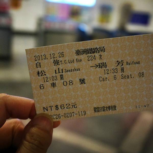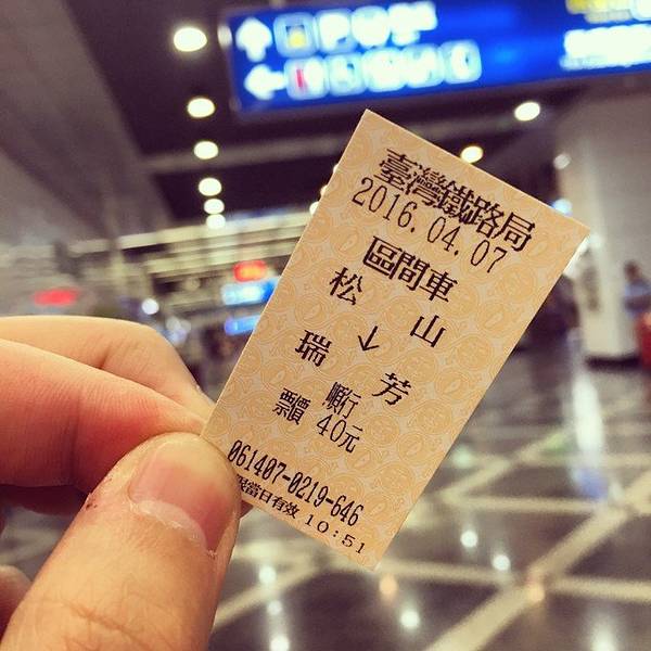 第二天原本安排一整天去九分 和 平溪线一日游的,结果。。。。到了瑞芳之后立马在车站买了平溪线一日游的车票,玩的不亦乐乎,回到瑞芳已经晚上6点了,看来是只能把九分放到第二天了。 早上起床,下楼到对面的7-11买好早餐和矿泉水,然后步行去松山站,购买到瑞芳的车票,40新台币,就人民币几块钱吧,我买的是区间车,如果买自强号的话可能会贵一点点但是我觉得区间车比较有特色~