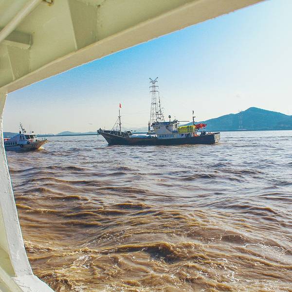 大叔哪里懂没见过几次海的我的心情啊,一切都好新鲜。一路的海水都是泛黄的,大家都走到船外吹风。